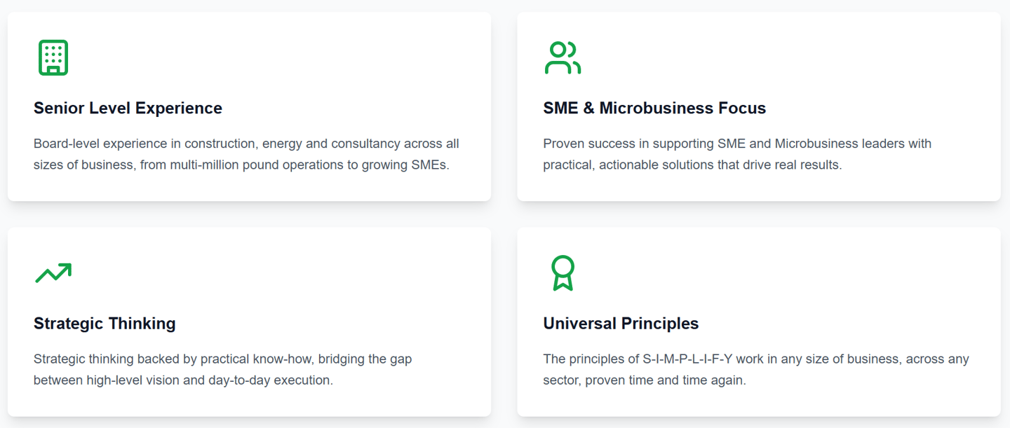 While I have specialist experience in specific sectors, the S-I-M-P-L-I-F-Y model is sector-neutral and proven to work across all industries.